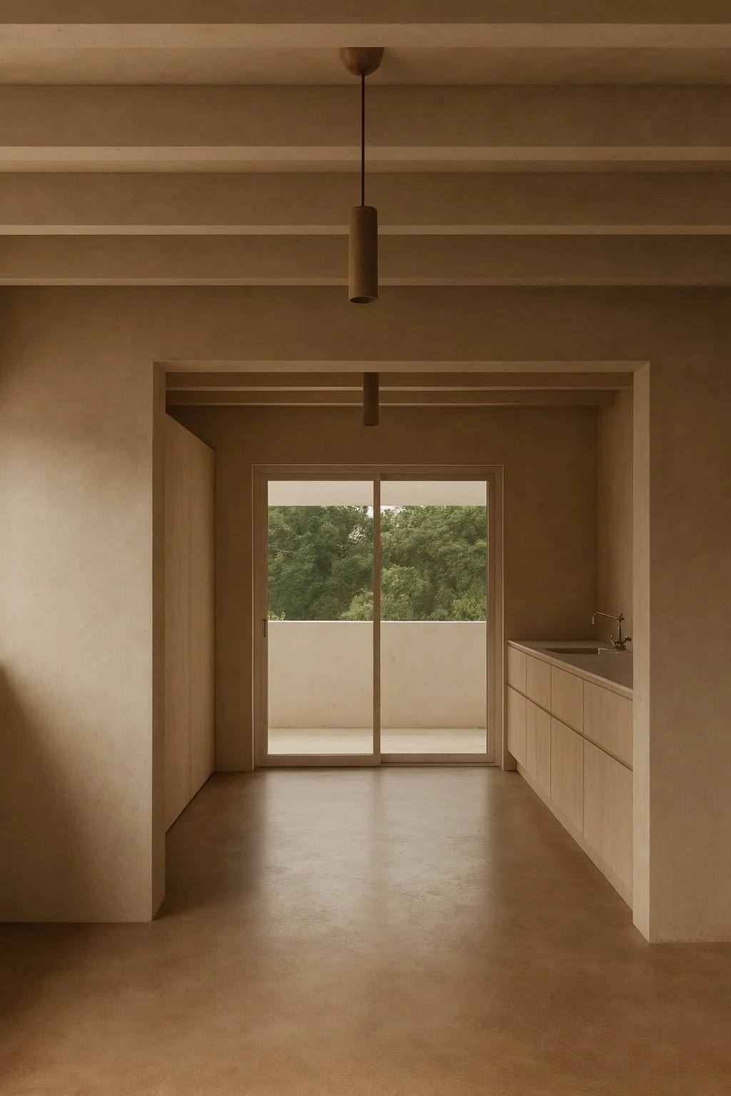 Les deux niveaux créés accueillent un duplex traversant. La faible largeur de l'immeuble a naturellement orienté le parti architectural vers un appartement en T3 ouverts de façade à façade, favorisant la ventilation naturelle et élargissant la perception des espaces. Le sol en chape lissée, sans joint, accompagne cette lecture fluide et continue. Les parois intérieures, réalisées en panneaux de bois enduits, prolongent cette intention par un travail d'homogénéité des surfaces, des angles maîtrisés et une matérialité douce, contribuant à une perception globale cohérente et apaisée.